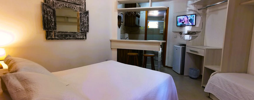 Descrição: Unidades térreas com sacada de frente para o jardim. Ambiente integrado de quarto casal com mini cozinha equipada com microondas e fogão.